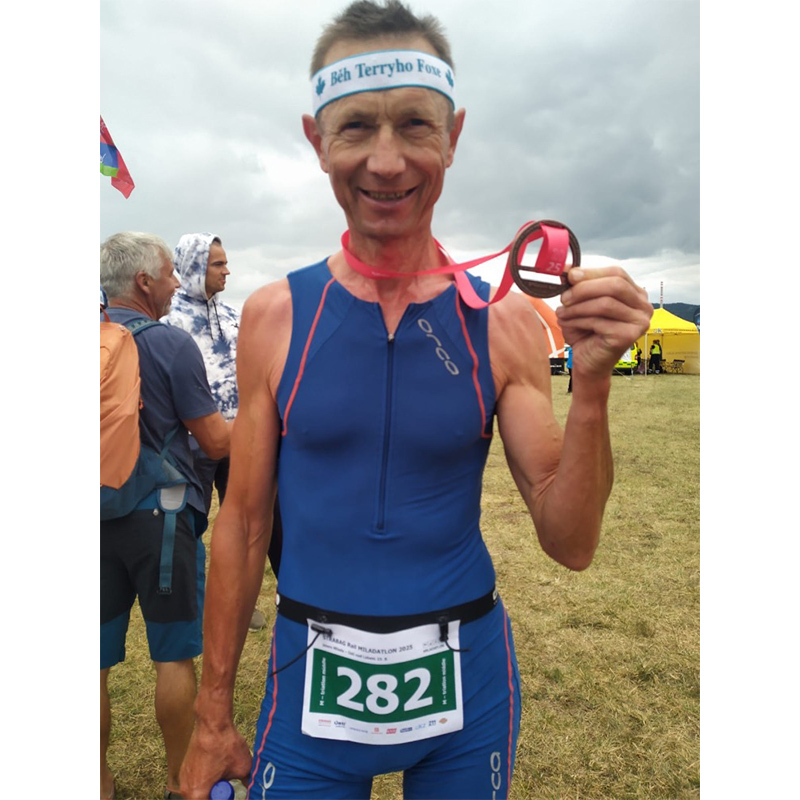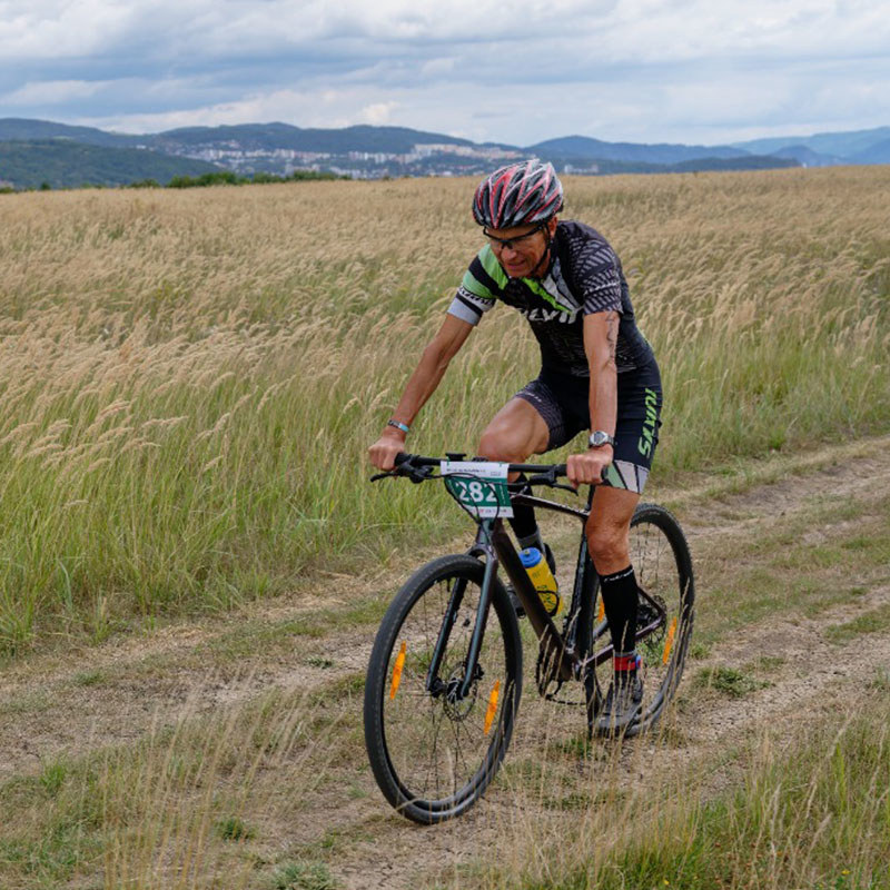 Před posledním stoupáním v prvním okruhu mi ale přestalo kolo řadit a řetěz spadl na nejmenší pastorek (10 zubů)! Záhy jsem zjistil, že se mi uvolnilo lanko na přehazovačce. Imbusy jsem neměl, a tak nezbývalo, než strmější kopečky vytlačit a kde to šlo rvát to ve stoji. Nohy jsem měl jako ingoty. Každého, koho jsem předjížděl, jsem se ptal, zda nemá imbusy. Nakonec mi je v depu podal zdravoťák ze sanity. Lanko jsem dotáhl a vydal se minimalizovat ztrátu. Kolo sice neřadilo perfektně, ale já jsem byl rád, že nemusím jet brutální převod. Pár lidí jsem ještě předjel. V závěru kola ještě prudce sprchlo se silným protivětrem, a tak brýle KEEN mi udělali dobrou službu. V běhu jsem nic nevzdával a v obou okruzích tlačil na pilu. Hanka mě tradičně povzbudila a fotila můj boj s větrnými mlýny. Doběhl jsem za Markem na 2. místě v kat M50+ s odstupem 4:18 min (celkově na 5. místě z 72 finišerů). I tak jsem spokojen, protože jsem technický problém vyřešil a potkal spousty kamarádů a užil si pěkný den.