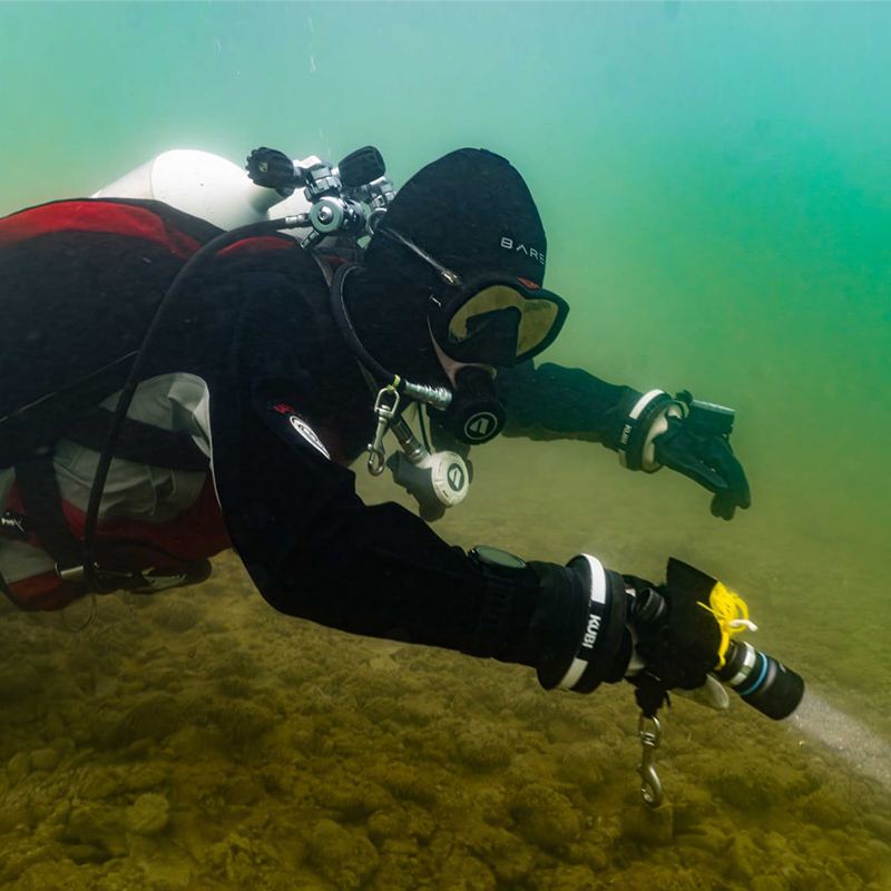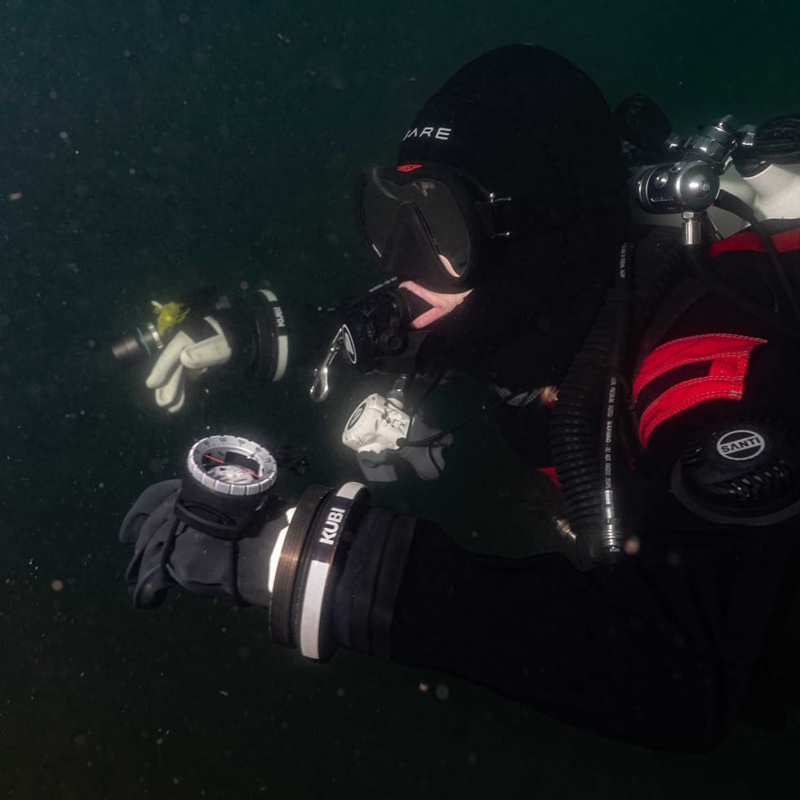 Když jsem se vyhrabala z bláta a své pošramocené ego se snažila umýt ve vodě, shledala jsem, že mí parťáci se potýkají s ještě většími problémy. Jeden se snažil nerozbít foťák při svém vlastním skluzu, druhý ztratil ploutev ve viditelnosti, která nebyla nulová, nýbrž doslova mínusová. Tato skutečnost nás poměrně znejistila, ale ploutev se úspěšně našla (a ihned se stala záchytným navigačním bodem, abychom se neztratili). Foťák přežil. A můj špinavý zadek umyl...Hluboký nádech, výdech a ponořili jsme se pod hladinu. Vstříc… neznámu.