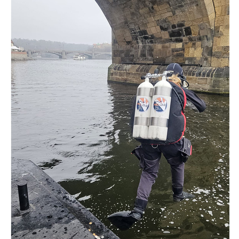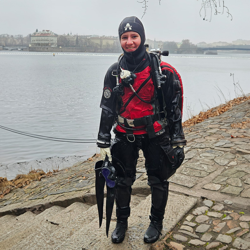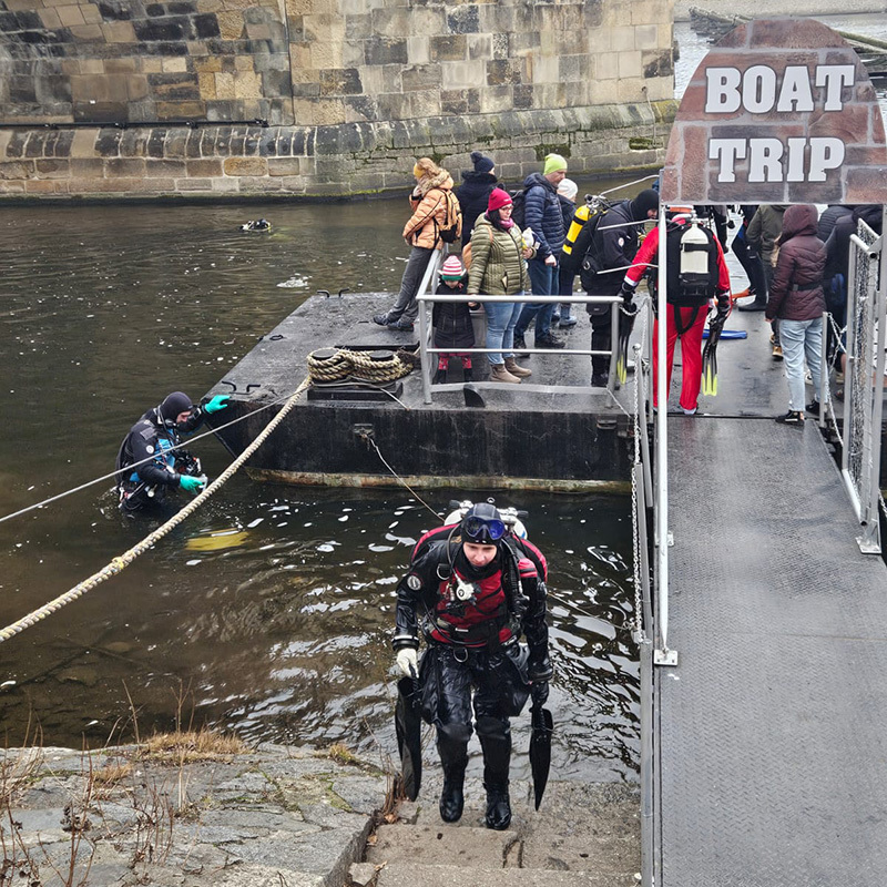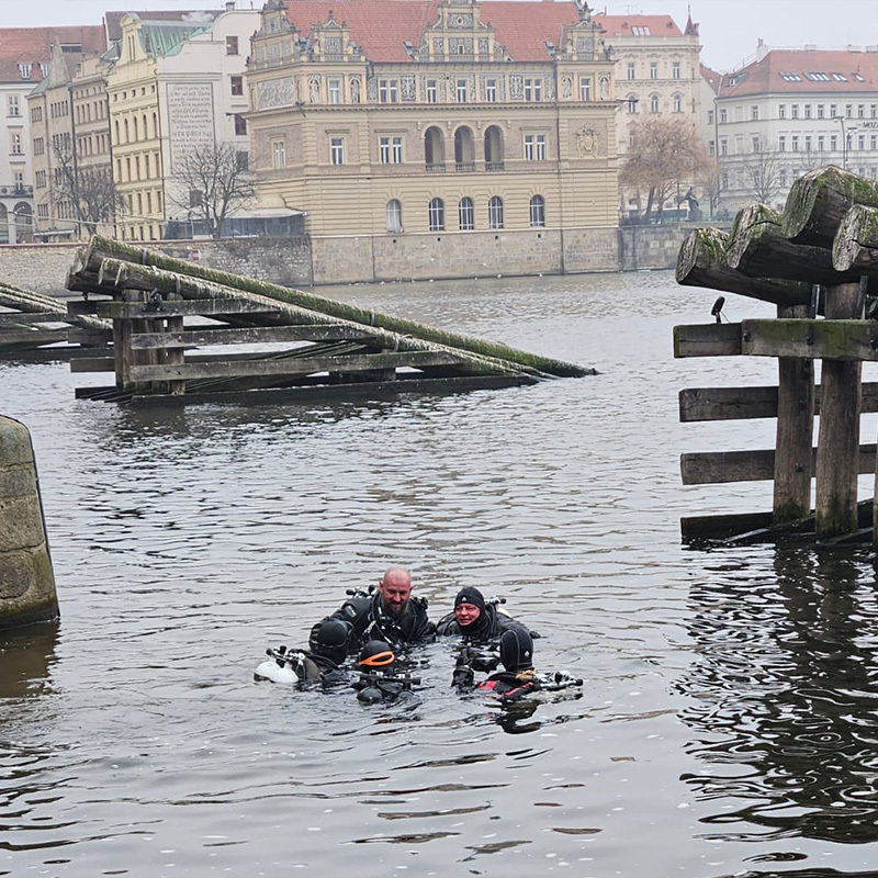 Kamarádi mi uštědřili pár nechápavých pohledů a raději zaveleli, že je čas na fotku. Shodili jsme výstroj a jen v sucháčích se rozběhli na most. Překvapení turisté se rychle klidili stranou a za chvíli byl Karlův most poloprázdný. Nasávala jsem vánoční atmosféru plnými doušky a zaplavil mě pocit neskutečného štěstí a vděčnosti. Nejen za to, že jsem se konečně dostala na tuto nádhernou akci, ale především proto, že mám kolem sebe úžasné lidi – svoji potápěčskou rodinu, za kterou se vždy ráda vracím a díky které považuji Čechy stále za svůj domov.