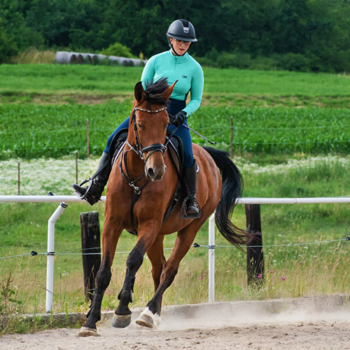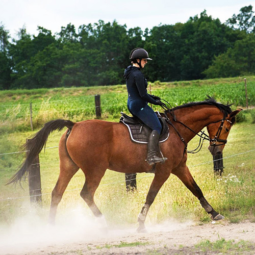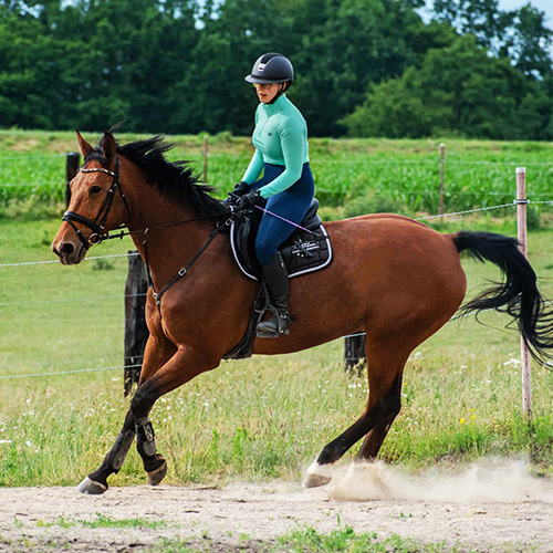 Oblíbila jsem si zejména tmavě modré jezdecké legíny ZETA LADY, které jsou vyrobeny z velmi příjemného, prodyšného a elastického materiálu. Na boku mají praktickou kapsičku na mobilní telefon, oceňuju i celosedový protiskluzový grip. Za mě jsou legíny skvělé do teplejších dnů, hlavně díky jejich lehkosti. Grip perfektně drží jezdkyni v sedle v jakékoli situaci.