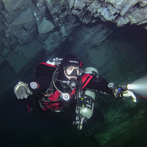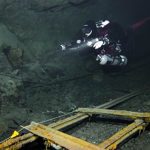 Důl Hraničná je bývalý důl na těžbu rudy železa, magnetit a hematit. Těžba zde probíhala v letech 1854-1967. Tento český důl byl můj velký sen a výzva už od chvíle, co jsem se rozhodla začít s potápěním. A jelikož sny se mají plnit, o pár let později jsem konečně stanula před vstupem. Hlavou mi proběhla myšlenka na to, kolik cesty jsem musela ujít, abych si tento malý/velký sen splnila. Nadechla jsem se a s pocitem posvátné úcty vkročila do tmy...a shodila na sebe téměř všechny vozíky na vybavení. Dobře, veškerá důstojnost a sebeúcta odešly do věčných lovišť a já si celá rudá šla nastrojit lahve a naložit vše na popadané vozíky. Už jen samotná cesta k vodě mě nadchla. Procházet dlouhými chodbami hluboko pod zemí, dýchat vlhký studený vzduch prosycený vůní hlíny a nasávat atmosféru plnými doušky je bezesporu velký zážitek. Luky, jakožto zkušený potápěč na Hraničné, to sice tolik neprožíval, ale já – nováček jsem nevěděla, kam se dívat dříve. V podzemí bylo o poznání tepleji než na povrchu, což byla příjemná změna. I křišťálově čistá voda se teplotně pohybovala okolo 8°C. Zanořili jsme se do tajemné tmy, světla okamžitě ozářila prudce klesající cestu do hloubky. Absolutně fascinována okolím jsem pomalu proplouvala mezi dřevěnými trámy, které podpíraly těch několik desítek metrů skály nade mnou. Během pár minut na mě dýchla atmosféra dávné minulosti. Staré důlní vozíky, zapomenuté, opuštěné a navždy uvězněné pod vodní hladinou, drobné pozůstatky po těžbě v podobě kovových skob a dalších železných částí pokrytých rzí... Stále se bylo na co dívat. Jakožto milovník historie jsem byla ve svém živlu. Jeskynní potápění miluji, ovšem potápění v dolech má úplně jiné kouzlo. Dekompresi jsme si zpříjemnili v jedné z mělčích chodeb a poté trochu zmrzli při pauze v šesti metrech. Mohli jsme sice využít habitat (dekompresní stan), který by jistě lepší tepelný komfort zajistil, já se však nemohla nabažit prohlížení okolí. Myslím, že v hloubce 6 m jsem prozkoumala do detailu každý centimetr stěn i kamenů. Ven z vody se mi opravdu nechtělo. Tento zážitek byl velmi silný a dalece předčil všechna má očekávání. Musím rozhodně zmínit milý a ochotný přístup majitele, který přispěl k tomu, abychom si Hraničnou užili naplno. Hned po odjezdu jsem začala plánovat návrat. :-) Na povrchu nás uvítalo sluníčko a teplo! Za ty dvě hodiny se ze zimy stalo jaro. Proto jsme zbytek dne využili k výletu. Pak už stačilo jen dořešit detaily a vyrazit do dolu Maria Concordia.