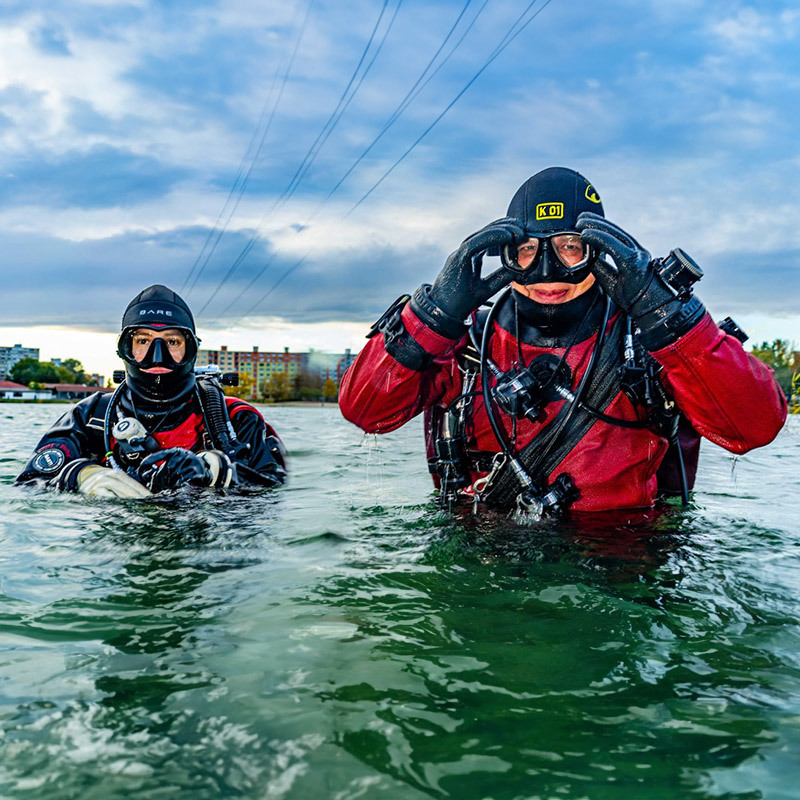 Když jsem se vyhrabala z bláta a své pošramocené ego se snažila umýt ve vodě, shledala jsem, že mí parťáci se potýkají s ještě většími problémy. Jeden se snažil nerozbít foťák při svém vlastním skluzu, druhý ztratil ploutev ve viditelnosti, která nebyla nulová, nýbrž doslova mínusová. Tato skutečnost nás poměrně znejistila, ale ploutev se úspěšně našla (a ihned se stala záchytným navigačním bodem, abychom se neztratili). Foťák přežil. A můj špinavý zadek umyl...Hluboký nádech, výdech a ponořili jsme se pod hladinu. Vstříc… neznámu.