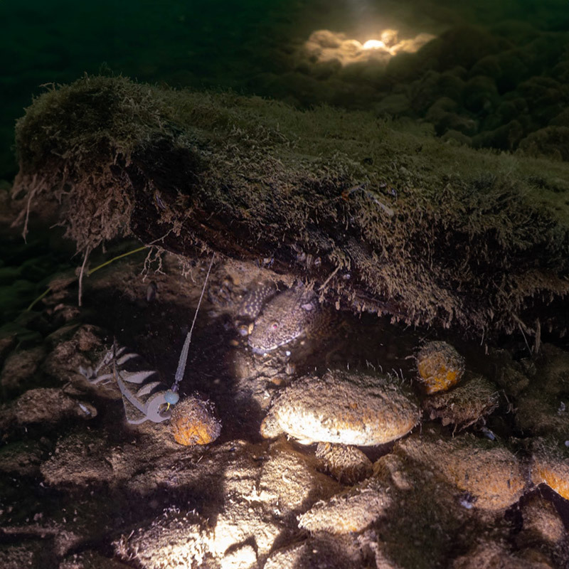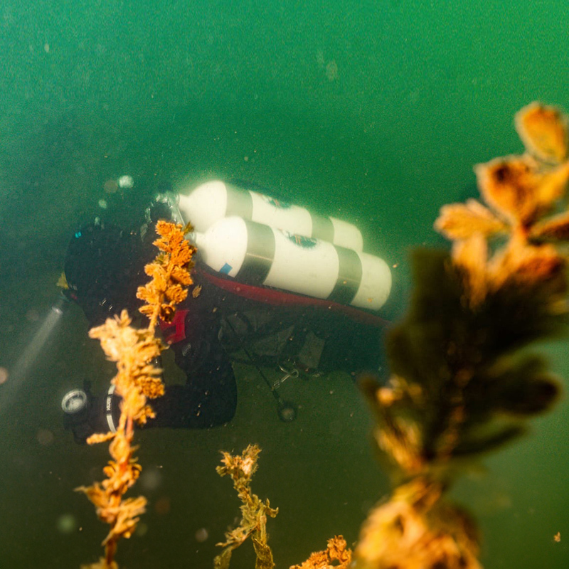 Chvilková zelená mlha pokračovala ještě asi dva metry, ale náhle se před námi otevřela velice slušná viditelnost. Soudě dle vykulených očí chlapců, překvapilo je to ještě více než mě. Dno sice pokrývaly nánosy bahna, ale s trochou šikovnosti se nám podařilo sestoupit až do hloubky 12 m bez toho, abychom zdvihli vrstvu sedimentu. Plán byl jasný. Přeplaveme jezero z jednoho břehu na druhý a vyhneme se rybářům. A tak jsme se vydali na průzkum dna. A že bylo co zkoumat! Po pár metrech jsme objevili ztracenou ploutev, pár plechovek, sluneční brýle a spoustu zajímavých rostlinek. Voda měla magický zelený nádech, který se mi okamžitě zalíbil. Dno se vlnilo a hloubka se rychle střídala. Chvíli jsme plavali v cca 7 m, aby nás vzápětí profil ponoru navedl zpátky do tmavých 12 m. Viditelnost se udržovala na slušných 3–4 m a povedlo se nám stále mít jeden druhého na dohled.