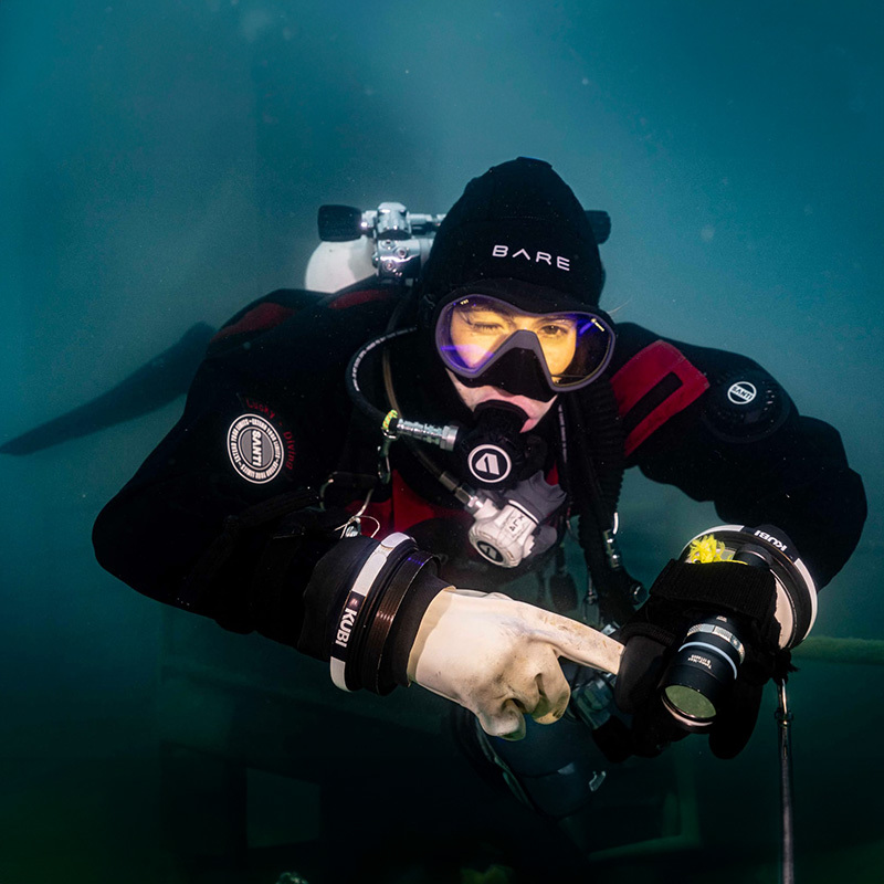 Další důležitá součást technického potápěče jsou suché rukavice, které se ale dají buď vyměnit za klasické neoprenové, do kterých proudí voda, nebo si je nebrat vůbec. Do suchých rukavic používám v létě vložky od Progress – Slimy, které jsou sice určené primárně na běh, ale mně se tak osvědčily, že jsem do nich zbláznila nejednoho parťáka. A všichni jsou spokojeni. V zimě je vyměním za tlusté vlněné rukavice, nebo vyhřívané rukavice na baterii.