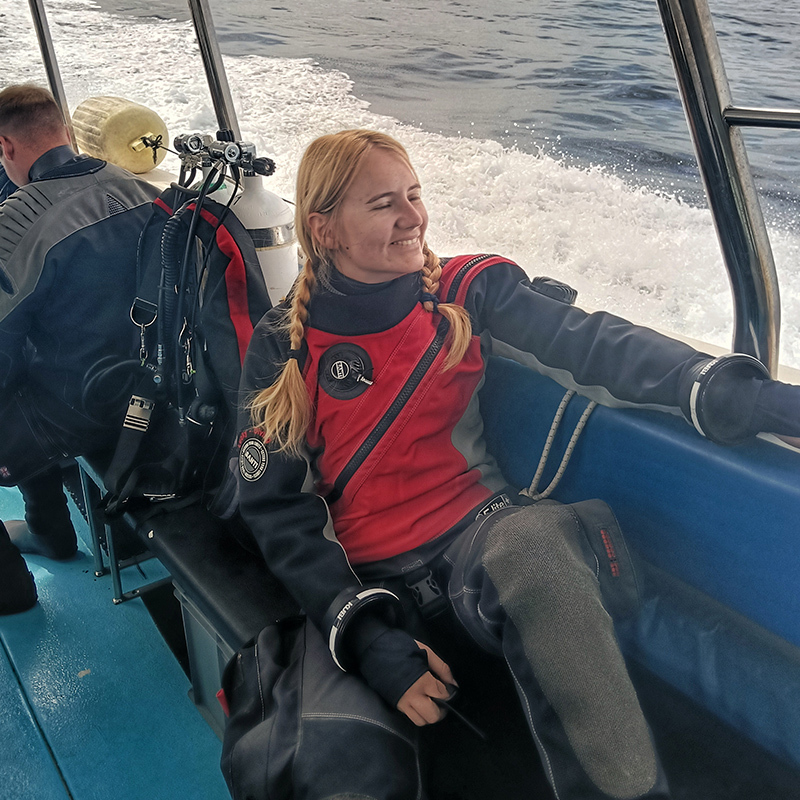 Na hladině mě udeřila realita přímo do obličeje. Přesněji řečeno byla to vlna, ale realita zní více poeticky 😀. Nalokala jsem se slané vody a bezmocně se chytila výtahu, který mě měl dopravit zpátky na palubu. Tiše jsem si visela a snažila se vysvětlit, že je to pro mě úplně poprvé, co se potápím z lodi. Podle instrukcí jsem se nakonec dostala na výtah a nechala se nejen vyvézt nahoru, ale i odstrojit, protože na to už jsem zkrátka sílu neměla. Vysloužila jsem si několik shovívavých pohledů. Následně jsem objevila další věc, která pro mě byla premiéra. Sprchu na lodi!! Nadšeně jsem ji popadla do rukou a nechtěně zmáčkla tlačítko. Proud vody mě málem znovu srazil do moře. Mike se opatrně otázal, jestli je to poprvé, co používám sprchu na lodi, nebo poprvé, co používám sprchu obecně. Au… 😀 Tančící a zpívající jsem ze sebe smyla zbytky soli a vydali jsme se na zpáteční cestu. Vítr mi foukal do mokrých vlasů, kapky vody mi dopadaly na tvář a já cítila absolutní štěstí a volnost. Na tento ponor budu ještě dlouho vzpomínat a z hodiny a půl pod hladinou jsem si užila každou minutu (kromě té, ve které jsem zápasila se “Stonefish” o skútr!).