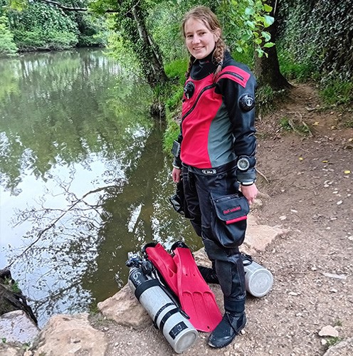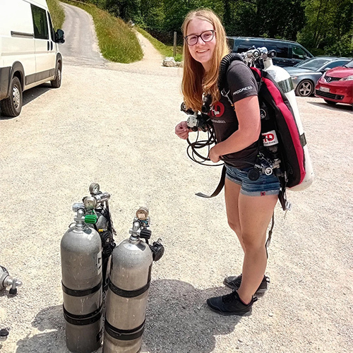 Druhý ponor v Resselu vyžadoval poněkud pečlivější a delší plánování. Chystali jsme se nejen na hlubší, ale i celkově delší a náročnější potápění. Všichni jsme si oblékli týmová trička od Progress Sportswear, které nám vyrobili přesně podle našich přání a vyrazili k řece. V nadšeném očekávání jsme nastrojili všech 5 lahví (dvojče a 3 stage) a začali vše nosit k vodě. Poté, co jsem nesla poslední lahev jsem se cítila na pokraji infarktu. Teplota se šplhala ke 35 stupňům a já se koupala dříve, než jsem vkročila do vody. Francouzský potápěč na břehu můj vzhled okomentoval slovy: "Life is hard, girl" a poté si se smíchem a lehkostí hodil vlastní lahve na rameno a chůzí (i vzhledem) modela se vydal ke svému autu. AU....