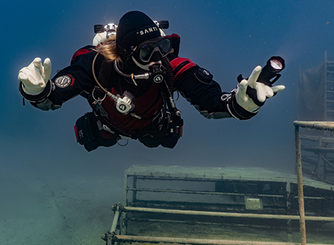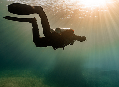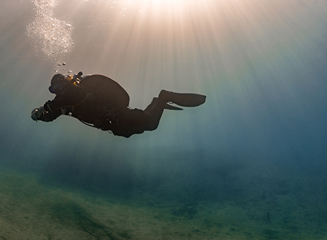 Když jsme se dostatečně vyblbli, nastal čas pokračovat v kochání se. Nádherné písečné duny na dně – moje milovaná měsíční krajina, se nyní jevila mnohem více realisticky, zvlášť když nám absolutní čistota vody dávala pocit, že levitujeme v prostoru. Absolutní zlatý hřeb ponoru (doslova) nastal, když vodní hladinou pronikly zářivé sluneční paprsky. Ihned se okolo mě roztančila hra světel a barev. Dlouho jsem nic podobného nezažila. Na chvíli jsem zapomněla na zimu a jen fascinovaně sledovala, co slunce, i když stále slabé, dokáže vykouzlit. A přesně toto je jeden z okamžiků, kvůli kterým stojí za to tahat těžkou výstroj k vodě, mnohokrát zmrznout a tvrdě trénovat. Přála bych tento pocit zažít všem. A díky kamarádovi fotografovi jsme ho pro vás zvěčnili.