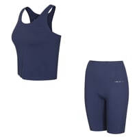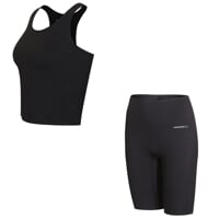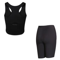 Set je vyrobený z měkkého, pružného a na dotek mimořádně příjemného materiálu. Nabízí funkční vlastnosti technického oblečení, laserem řezané okraje a lepené lemy eliminují švy, takže vše perfektně sedí, nikde netlačí a zaručuje naprostou volnost pohybu. Tílko díky laserové perforaci na hrudníku zajišťuje výborné odvětrávání i při intenzivním pohybu. Šortky zaujmou na první pohled svým designem i propracovaným střihem. Zdvojený laserem řezaný pas s embosovaným vzorem je nejen stylový, ale i funkční – tvaruje oblast bříška, drží na místě a zajišťuje pohodlí po celý trénink.